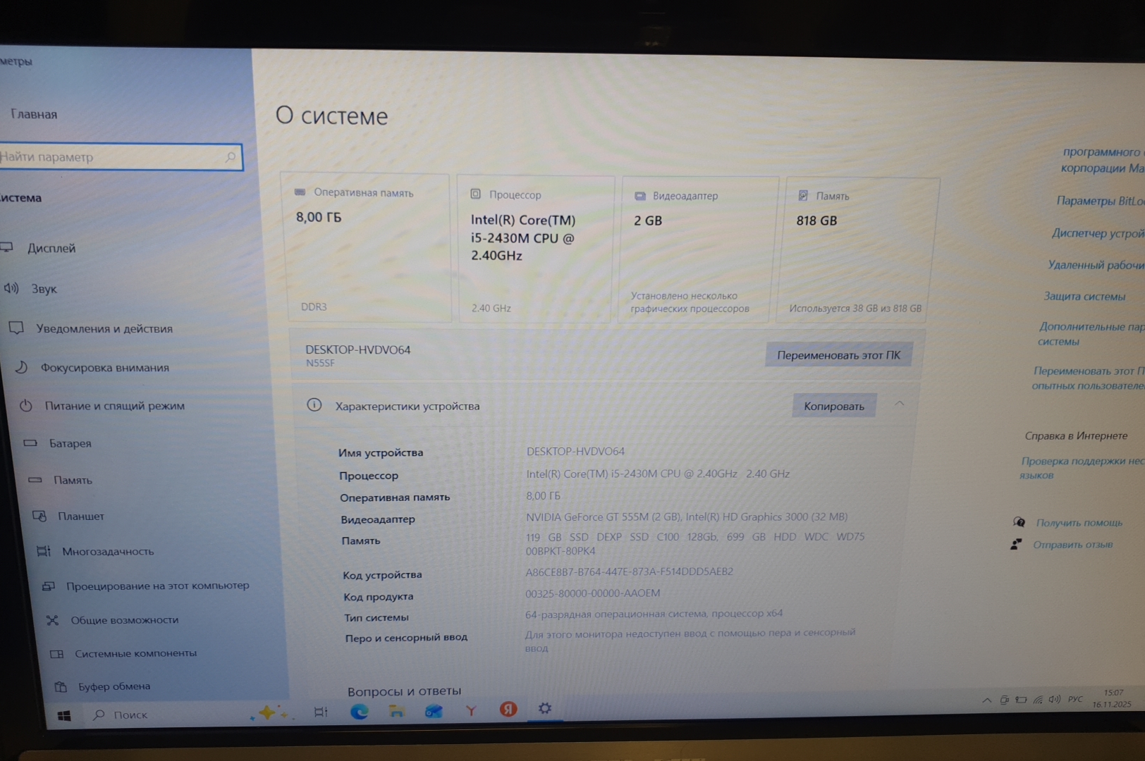 | Процессор | Intel Core i5-2430m 2.40 GHz |