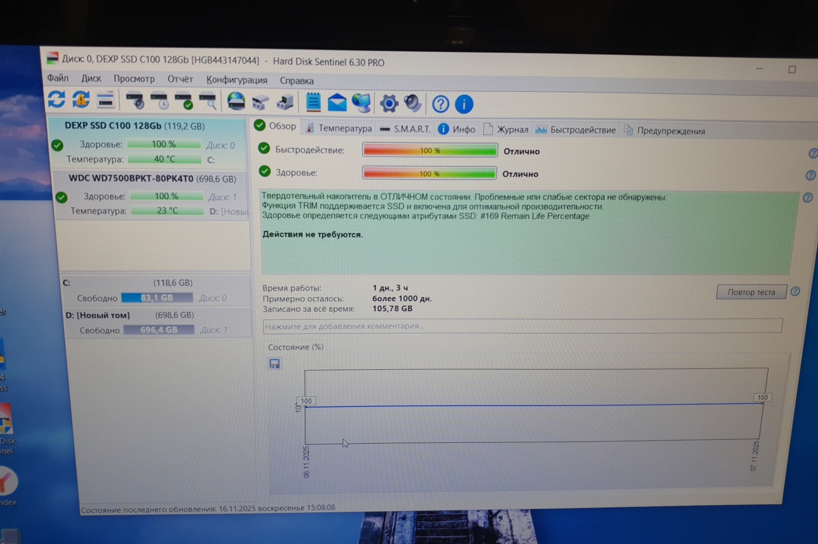 | Состояние HDD/SSD | 100%/Новый |