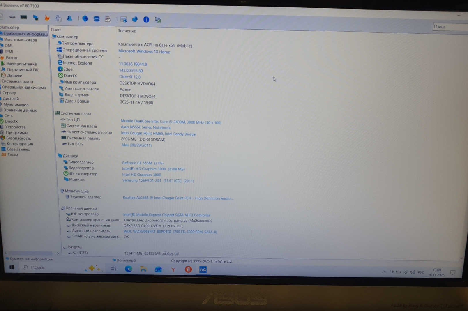 Asus N55SF (Intel Core i5-2430m/8Gb/SSD 128Gb+750Gb/Nvidia 555m/15.6/Win 10 Home)