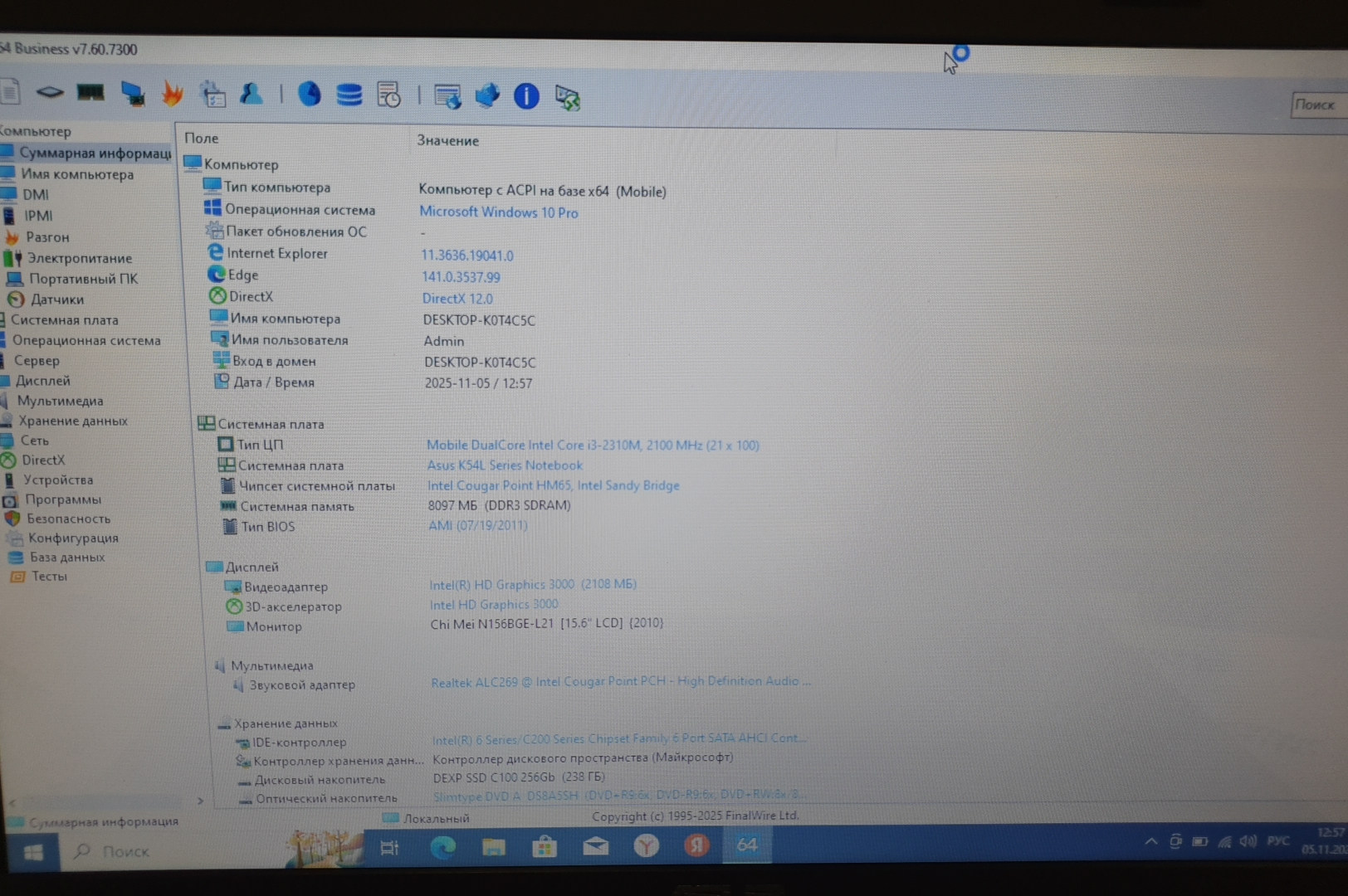 Asus X54L-SX048R (Intel Core i3-2310m/8Gb/SSD 256Gb/Intel HD 3000/15.6/DVD-RW/Win 10)