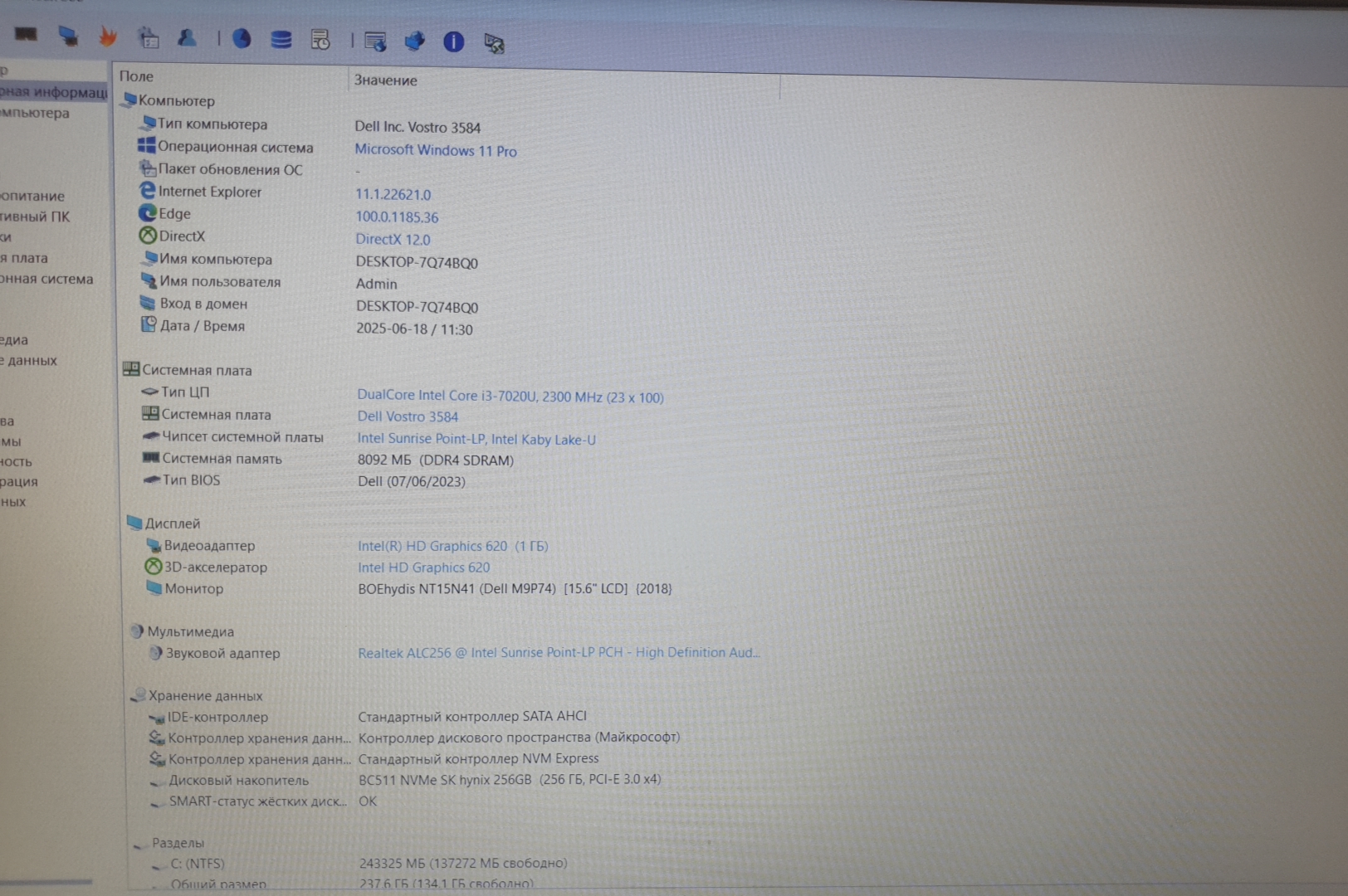 Dell Vostro 3584 (Intel Core i3-7020u/8Gb/SSD 256Gb/Intel HD 620/15.6/Win 11