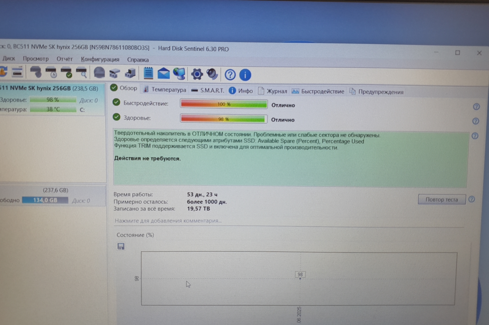 | Состояние HDD/SSD | 98% |