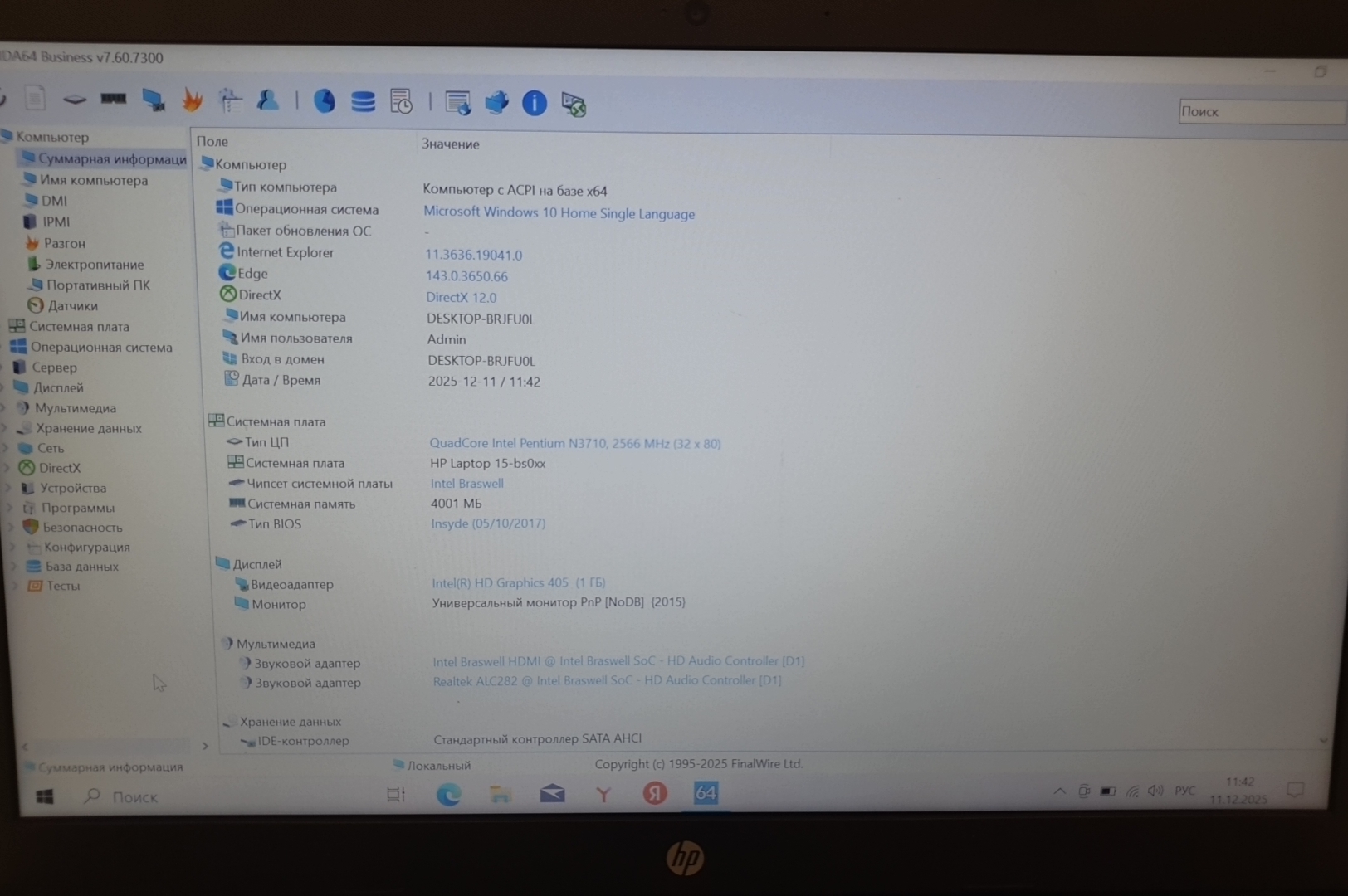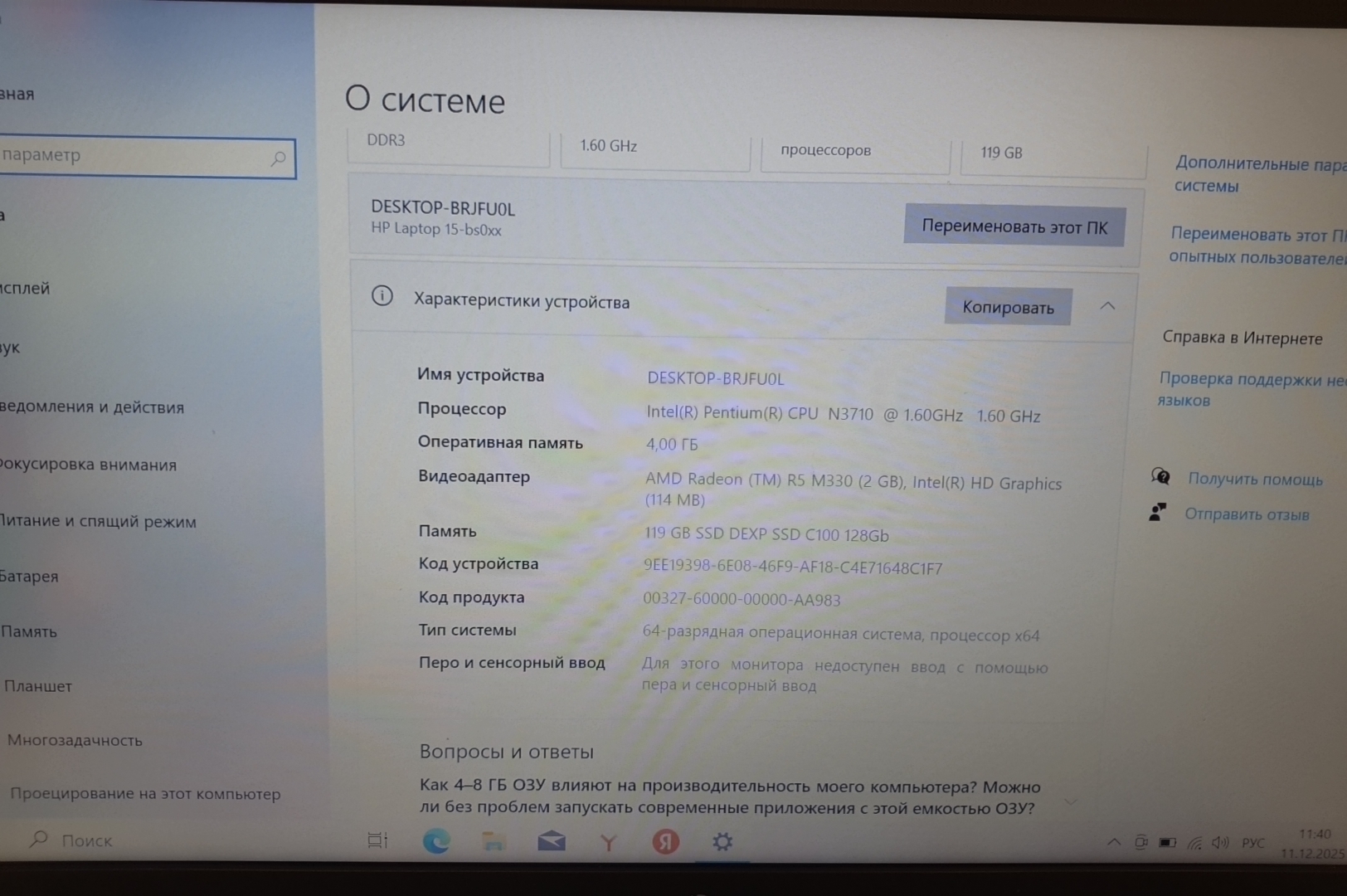 HP 15-bs091ur (Intel Pentium N3710/4Gb/SSD 128Gb/AMD Radeon R5 M330/15.6/Win 10)