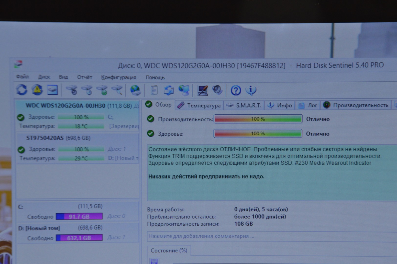 Состояние HDD/SSD | 100% |