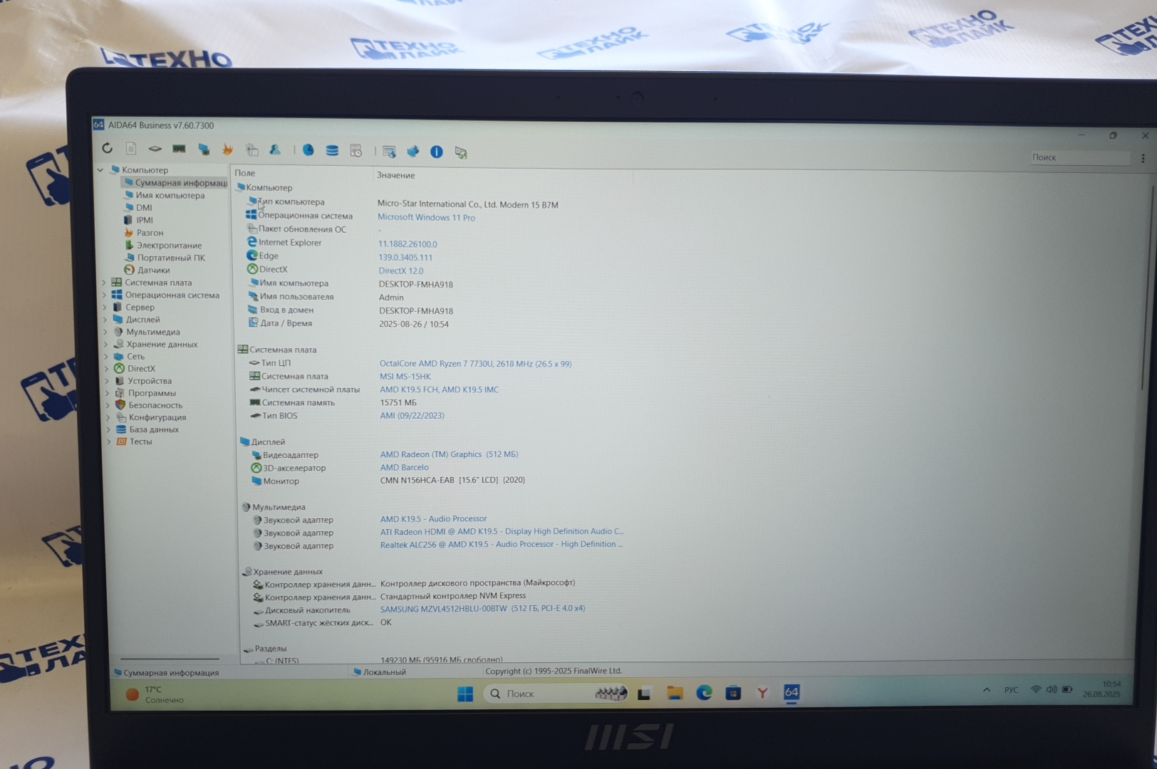 MSI Modern 15 B7M-217XRU (AMD Ryzen 7-7730u/16Gb/SSD 512Gb/AMD Radeon Graphics/15.6/Win 11)
