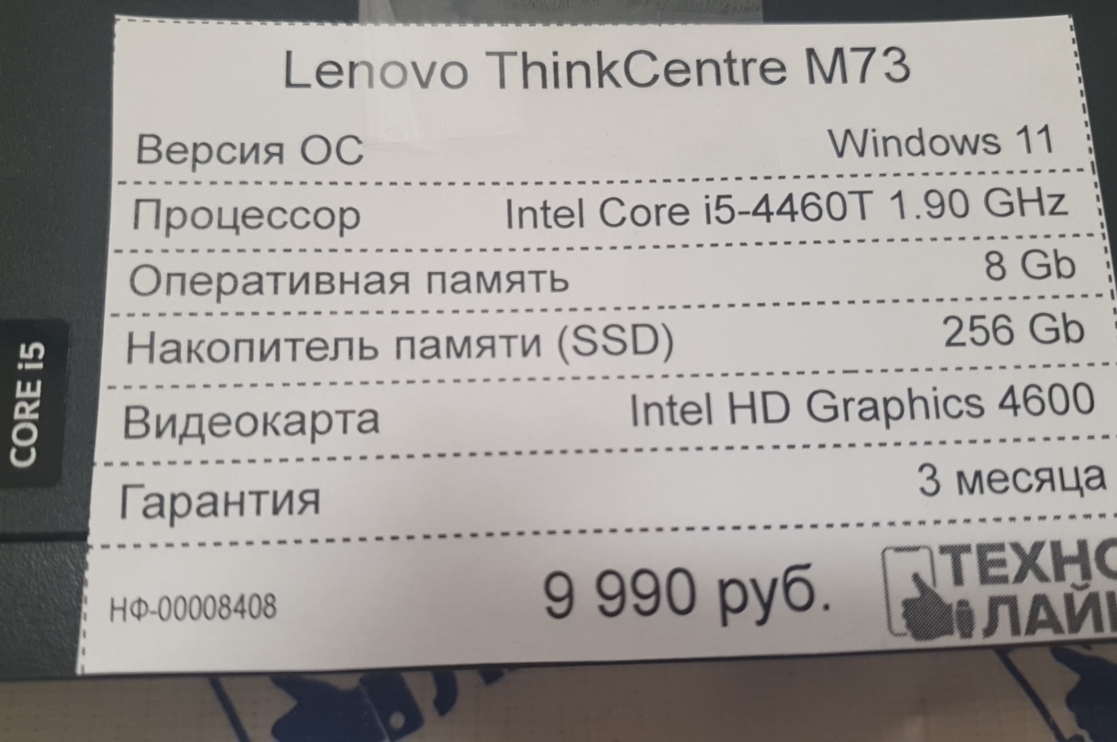 Неттоп Lenovo ThinkCentre M73 (Intel Core i5-4460T/8Gb/SSD 256Gb/Intel HD 4600/Win 11)